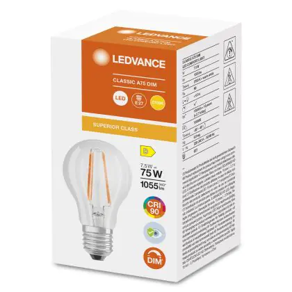 Ledvance Superior Classic LED E27 Pear Filament Clear 7.5W 1055lm - 927 Extra Warm White | Dimmable - Best Colour Rendering